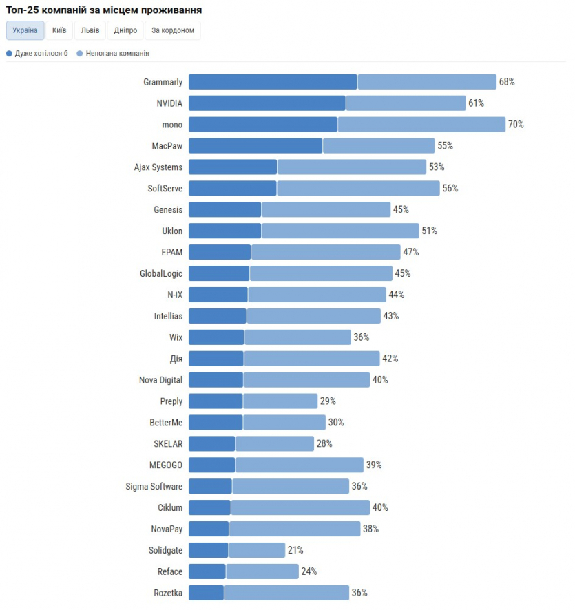 У Києві Grammarly безсумнівно займає перше місце, також у четвірці моніторингу — mono, NVIDIA та MacPaw. Кияни частіше відзначають продуктові компанії, такі як BetterMe, WIX, SKELAR і Solidgate.